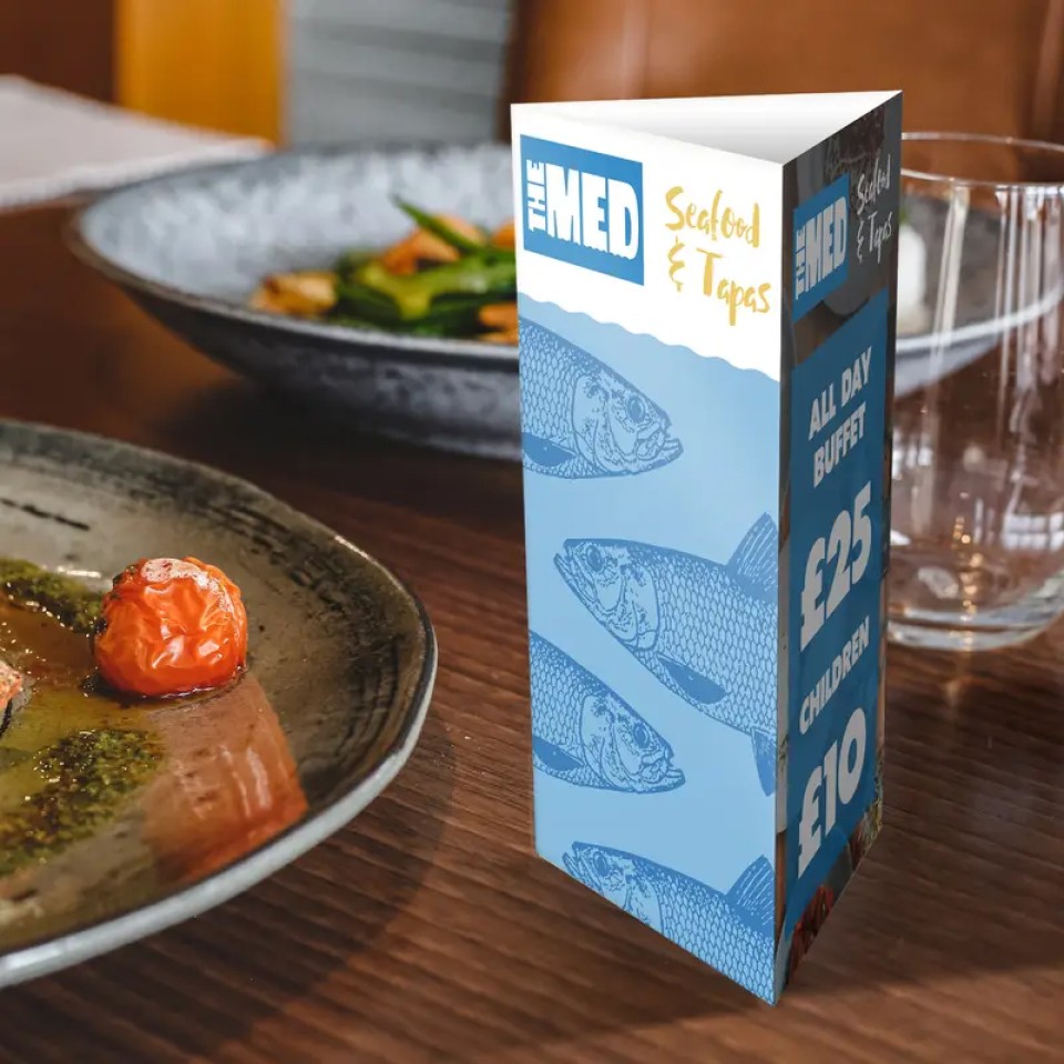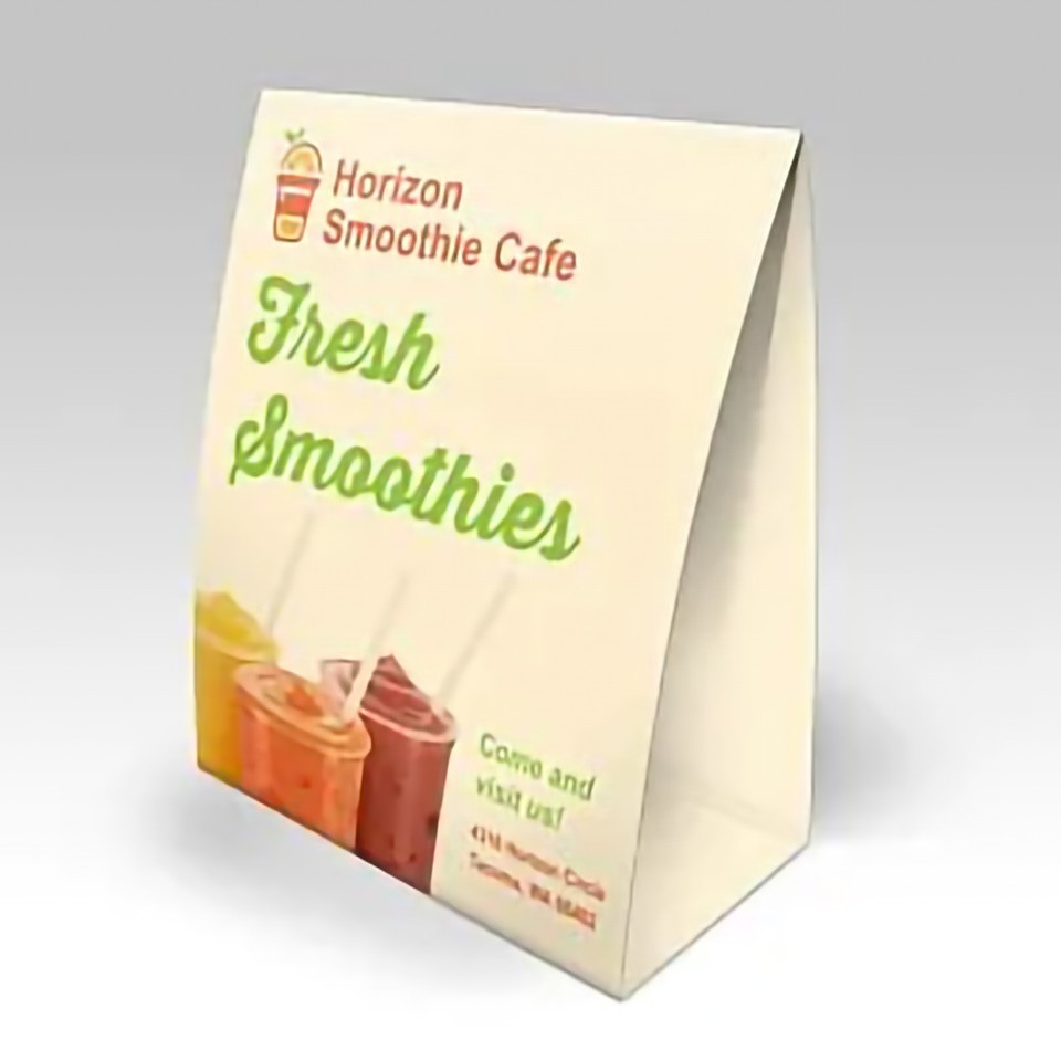 Full-colour printed table tent card on thick 325gsm Art Board Silk